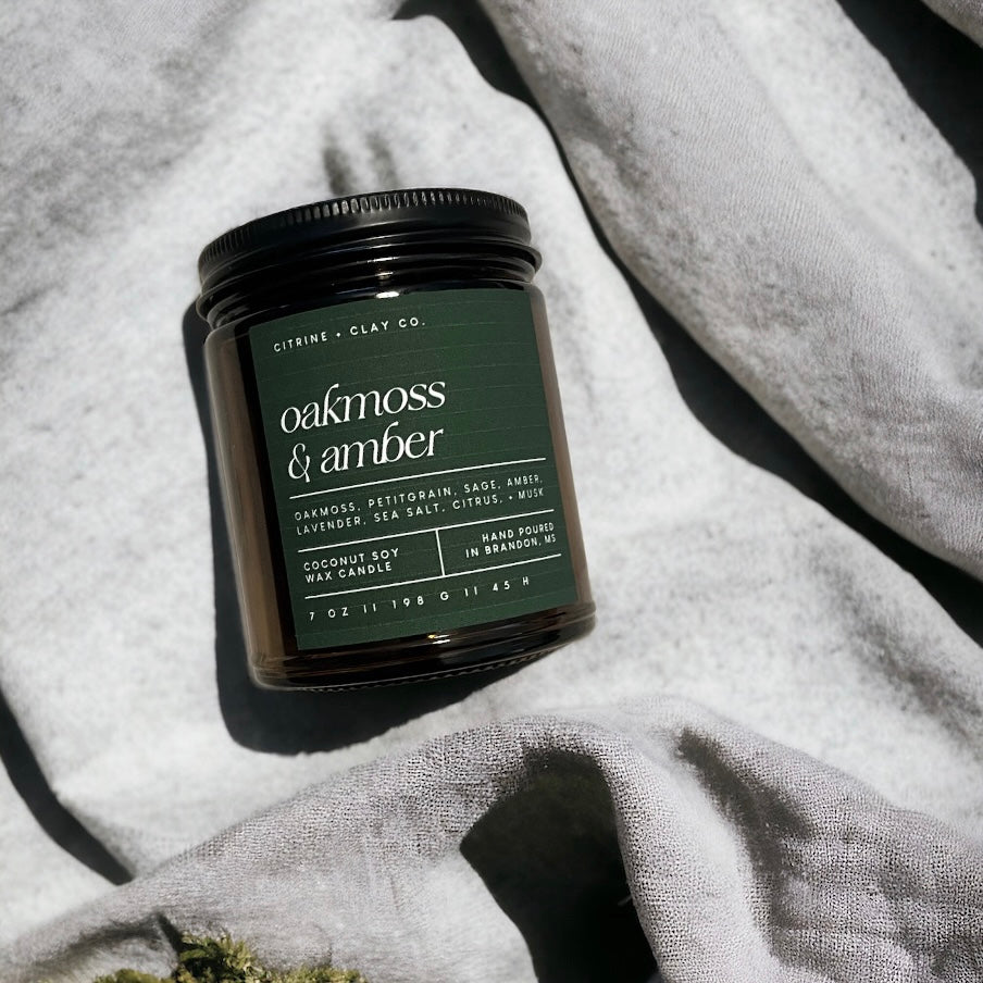 Oakmoss + Amber – Oakmoss, Petitgrain, Sage, Amber, Lavender, Sea Salt, Citrus, + Musk